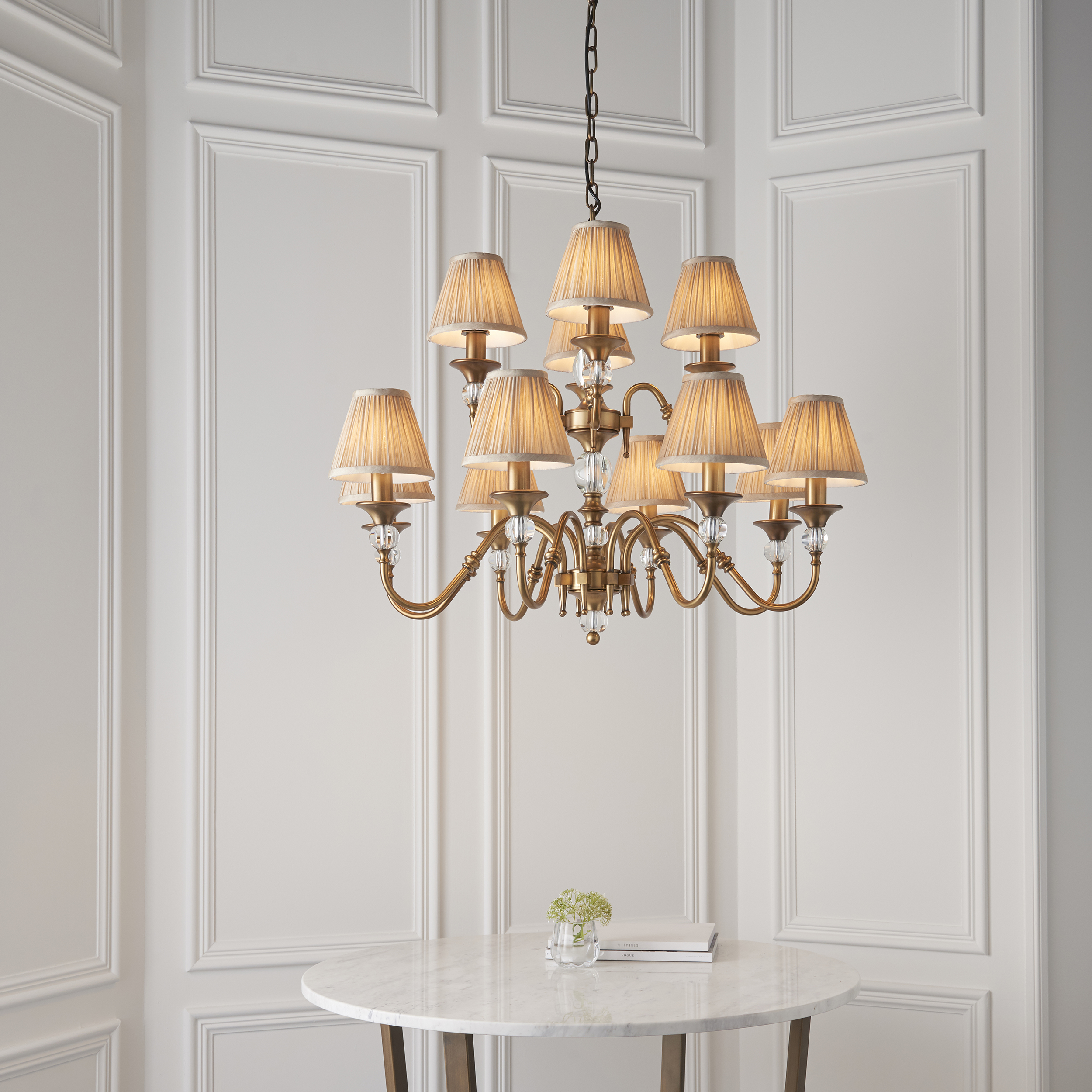 63585 The Polina antique brass 12-light pendant is an elegant addition to any room. Finished in an antique brass plate and adorned with k9 crystal glass detailing and beige organza effect shades to give it an opulent feel