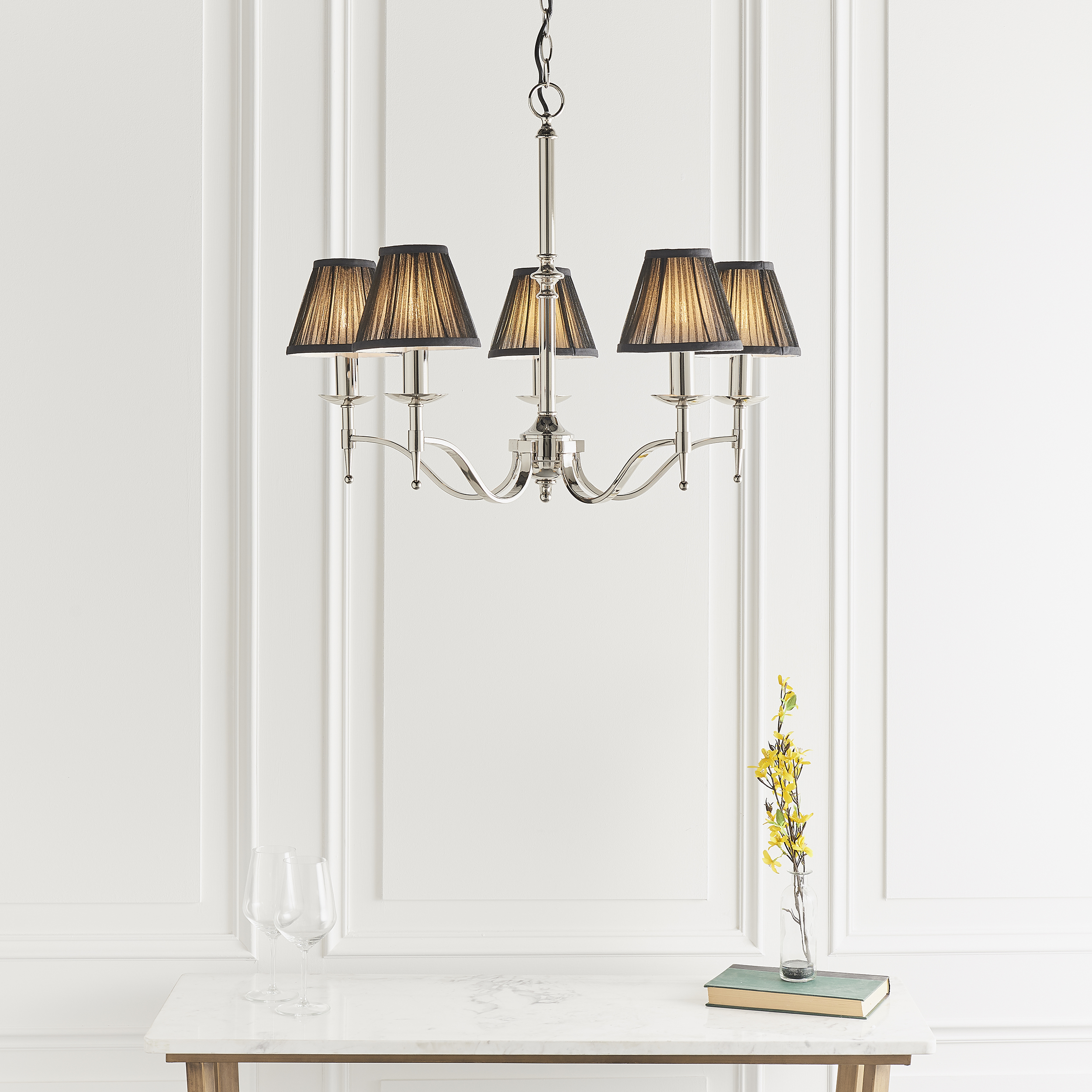 63637 The elegant 5 light pendant from the Stanford nickel range has beautifully curved arms and simple clean detailing. Its complemented by pretty, black organza effect shades. Matching items available