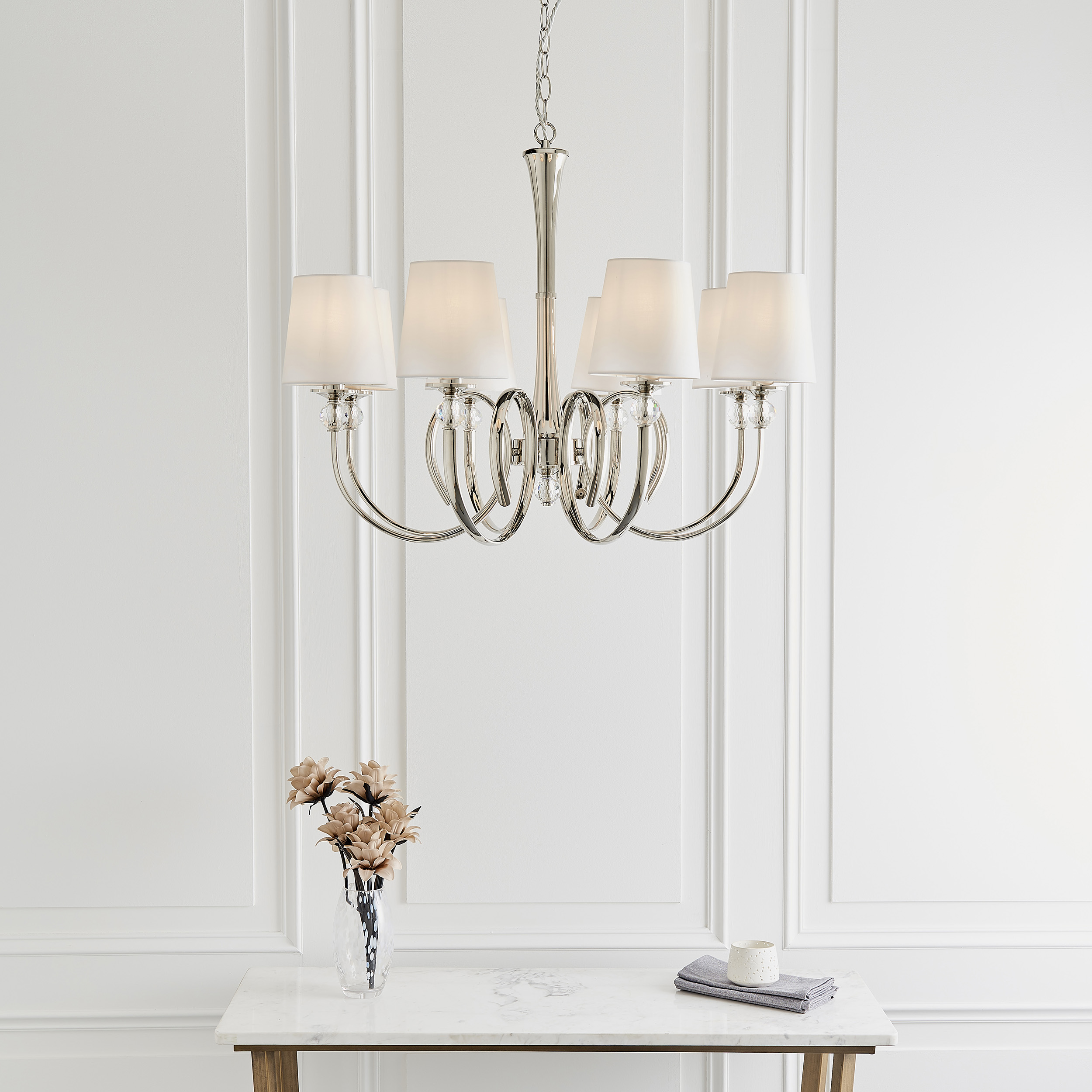 74433 A stunning 8 light pendant incorporating beautifully curved arms adorned with crystal glass detailing and finished in a polished nickel plate, further complemented by vintage white silk shades. Compatible with LED lamps and dimmable